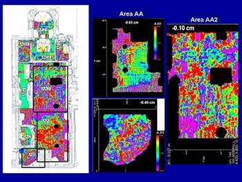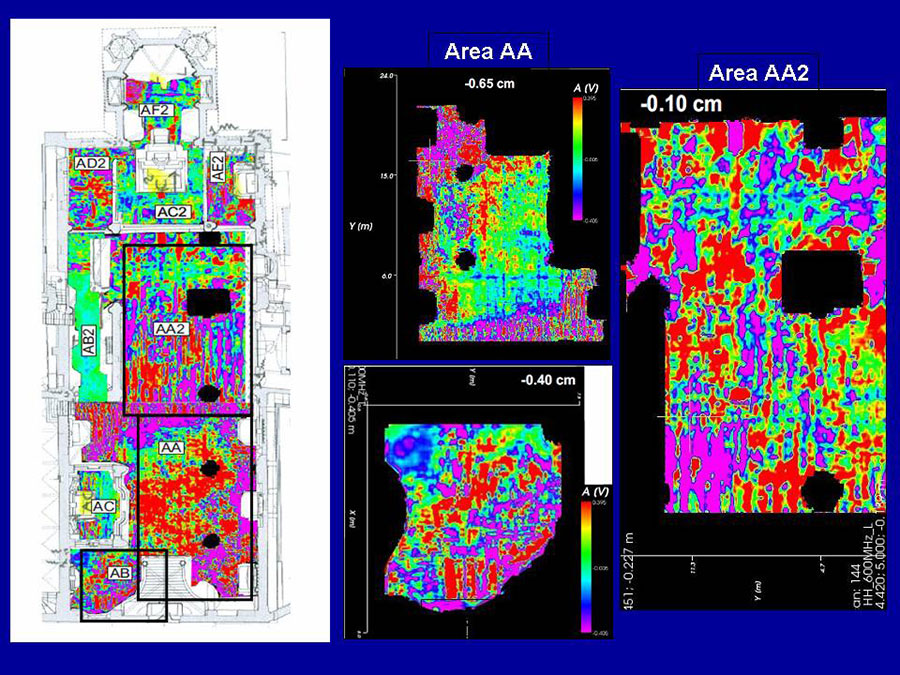 Nell’ambito di questo progetto la sottosuperficie della chiesa di San Giovanni è stata esplorata tramite un’acquisizione con antenne di frequenza 400 o 600 MHz movimentate secondo una griglia regolare ortogonale di cella 0.5 m. Si sono dunque ottenuti dati molto interessanti come la presenza di alcune sepolture collocate nella prima cappella a sinistra dell’ingresso e l’identificazione di una grossa camera ipogea nella prima metà della navata centrale.