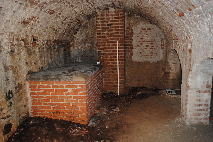 L’ambiente era pesantemente manomesso da recenti interventi (inizi del ‘900), infatti la superficie era piuttosto pulita, tranne per la presenza di rare ossa sparse. Lungo un lato lungo si sono identificati 5 cassoni litici relativi alle sepolture dei marchesi della famiglia Del Carretto (seconda metà del XIX secolo-prima metà del XX secolo), ognuna con la propria epigrafe relativa all’inumato. Sul lato opposto invece era presente un grosso cassone costruito in mattoni e sigillato da una grossa copertura di mattoni e malta cementizia, anch’esso datato ai primi decenni del secolo scorso. Creata una piccola breccia ed introdotta la torcia, è stato possibile identificare una gran quantità di ossa sparse e la presenza di almeno sette crani di adulti. Secondo la nostra opinione questo ossario è il risultato di una importante opera di ripulitura effettuata in epoca moderna per la costruzione dei loculi della famiglia Del Carretto; chi è intervenuto infatti ha rimosso gli scheletri precedentemente inumati e li ha posti, per pietas, nel cassone costruito ex novo.