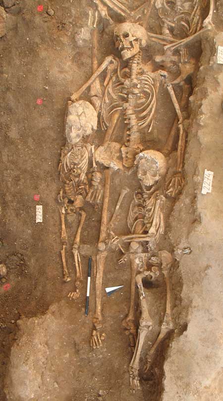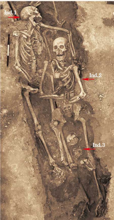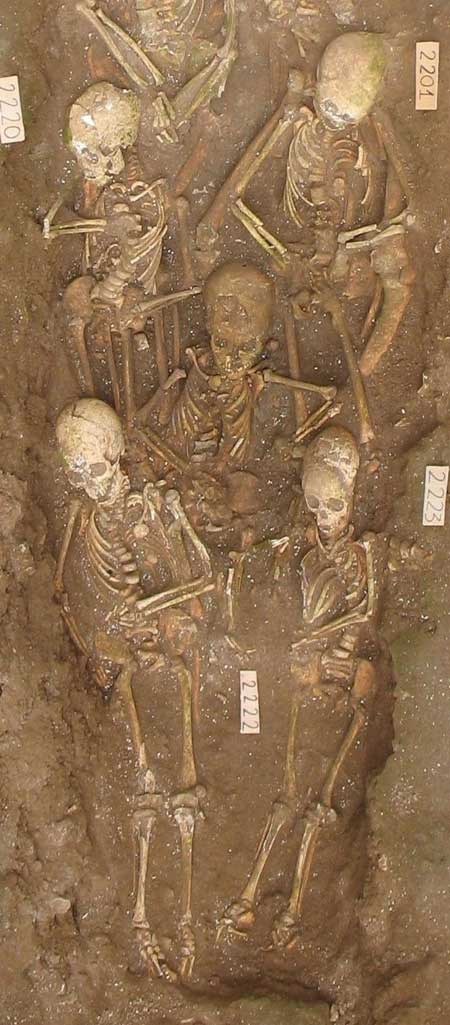 Questo ritrovamento riveste un carattere del tutto eccezionale. Sono state rinvenute 16 sepolture colletive “a trincea”, ovvero a fossa lunga (5-6m) e stretta, ciascuna contenente i resti composti di 10-15 individui in media (un massimo di 30 individui è stato registrato nella trincea n°10), deceduti contemporaneamente o a breve distanza di tempo da consentirne comunque il seppellimento simultaneo.